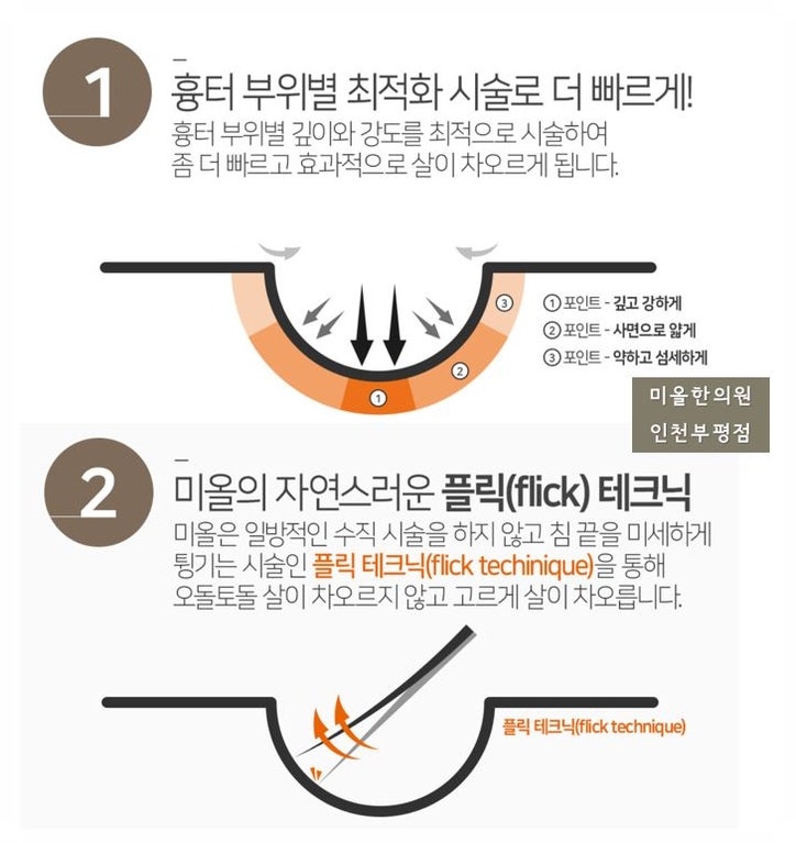 2~3회 시술만으로 변화되는 저자극 얼굴 흉터 시술로 수술 당일부터 화장을 지울 수 있습니다.부평의 함몰된 흉터는 침치료로 깔끔하게 채워드립니다