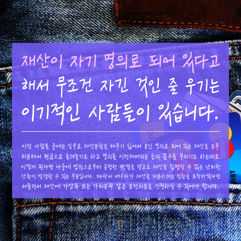 일부 이기적인 사람들은 재산이 자신의 명의로 되어 있기 때문에 무조건 소유하는 것이라고 주장합니다. 일부는 재산 분할이 싫어 재산을 모두 명의로 처분하거나, 인지하거나, 양도하기도 했다. 이렇게 되면 법원에서 공정한 판결을 받아도 재산을 집행할 수 없는 난감한 상황이 발생할 수 있습니다. 따라서 재산을 처분하고자 하는 사실을 배우자가 알게 된 경우에는 조속히 재산의 가압류 또는 가압류 기타 보전조치를 신청할 수 있어야 합니다. 제3자가 보전처분을 신청하는 조건으로 그 부동산을 매입한 사실이 있는 경우에는 소송을 통한 사기행위의 무효화로도 그 재산을 회수할 수 있습니다. 사실 재산분할소송을 실무에서 준비하는 것은 어렵지 않다고 할 수 있습니다. 어려움에 처했을 때 재산분할의 대상을 명확히 하고, 하나씩 출자청구권을 준비하고 보전조치를 취하는 것이 필요하기 때문에 처음부터 전문가에게 넘기는 것이 안전하다고 할 수 있습니다.