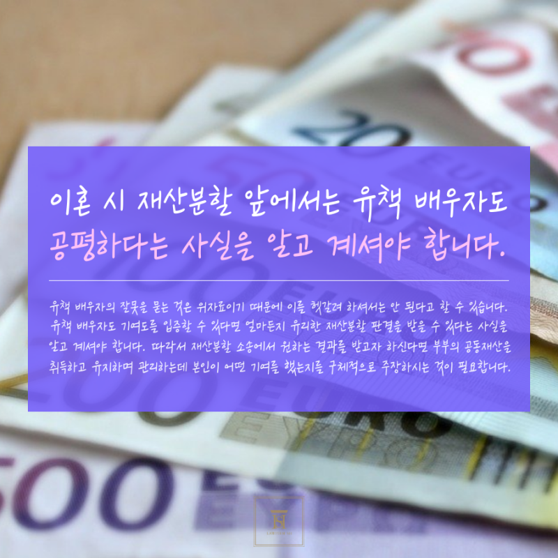 이혼 시 재산 분할에 있어서도 가해자 배우자가 공정하다는 사실을 아는 것이 중요합니다. 잘못한 배우자의 잘못을 추궁하는 것은 위자료이니 혼동하지 마세요. 책임 있는 배우자도 기여를 증명할 수 있는 경우 유리한 재산 분할 판결을 받을 수 있음을 알아야 합니다. 따라서 재산분할 소송에서 이상적인 결과를 얻으려면 부부 공동재산의 취득, 유지, 관리에 어떤 기여를 했는지 구체적으로 밝혀야 합니다. 기여에는 다양한 것들이 포함될 수 있습니다. 맞벌이로 재산형성에 직접적으로 기여한다는 사실, 집안일이나 육아를 통해 간접적으로 기여한다는 사실, 배우자가 번 돈을 관리하고 사업에 성공한다는 사실 등 이중으로 확인할 수 있어야 합니다.