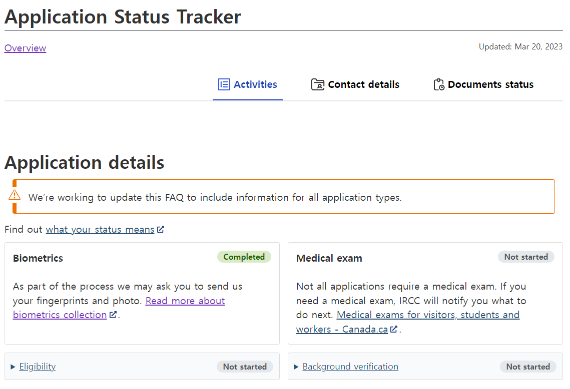즉, 트래킹 시스템(Online Application Status Tracker)을 이용하면 영주권 신청 후 트래커 시스템을 통해 신청자의 진행 상황을 상세하게 확인할 수 있고, 현재까지 어떤 일들이 있었는지 한눈에 알 수 있습니다. 이 추적 시스템은 2021년 5월 캐나다 시민권 신청자를 대상으로 처음 시행되었으며, 2022년 2월부터 배우자 및 자녀가 있는 이민자를 대상으로 시행되어 점차 사용자가 증가하고 있습니다. 그 후, 드디어 2023년 2월 대부분의 사람들이 사용하는 E응용 프로그램도 E 및 PNP로 확장되었습니다. 즉, 캐나다 영주권을 추구하는 하나) 연방 숙련 노동자 프로그램(FSWP) 2) 캐나다 체험교실(CEC) 3) FSTP(Federal Skilled Trades Program) 4) 주정부 추천 프로그램(PNP) 총 4개 분야에 지원하신 지원자분들이 사용하실 수 있습니다.